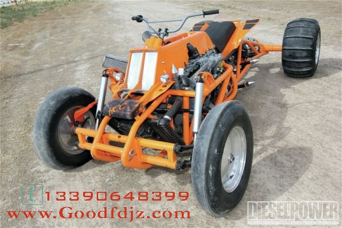 Jarod Hall居住在美国犹他州的Plymouth,经营着一家汽车改装店,主攻方向就是为车辆更换引擎。在这么多年的工作中,Jarod经常听到身边的顾客询问“能否将一台康明斯柴油发电机装进我的车”。一遍又一遍之后,Jarod决定实施行动,将一台康明斯装进一辆ATV。 Jarod在一辆车身损坏的98款公羊2500皮卡中拆出了这台康明斯12气门引擎,为了让动力匹配简单些,Jarod又从一辆两驱车型上找来了47RH四速自动变速器。车架完全由Jarod自己设计焊接,原材料为直径2英寸的圆钢管。为了保持其ATV的元素,车架上的车身面板是从雅马哈Banshee上拆下来的,并作修剪以适应钢管车架,随之而来的还有车座和车把。总体来看,这辆康明斯动力的ATV总质量约为971公斤,花费了Jarod超过两周的时间来制作完成。